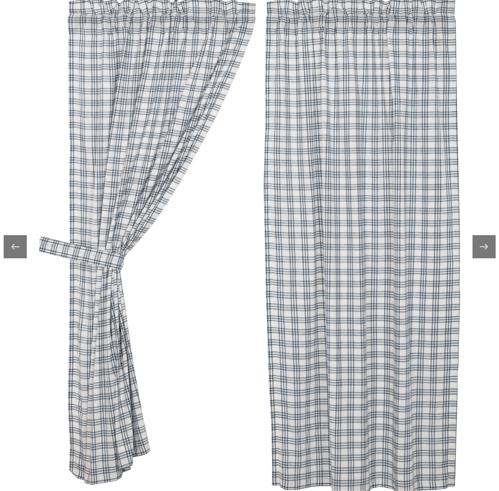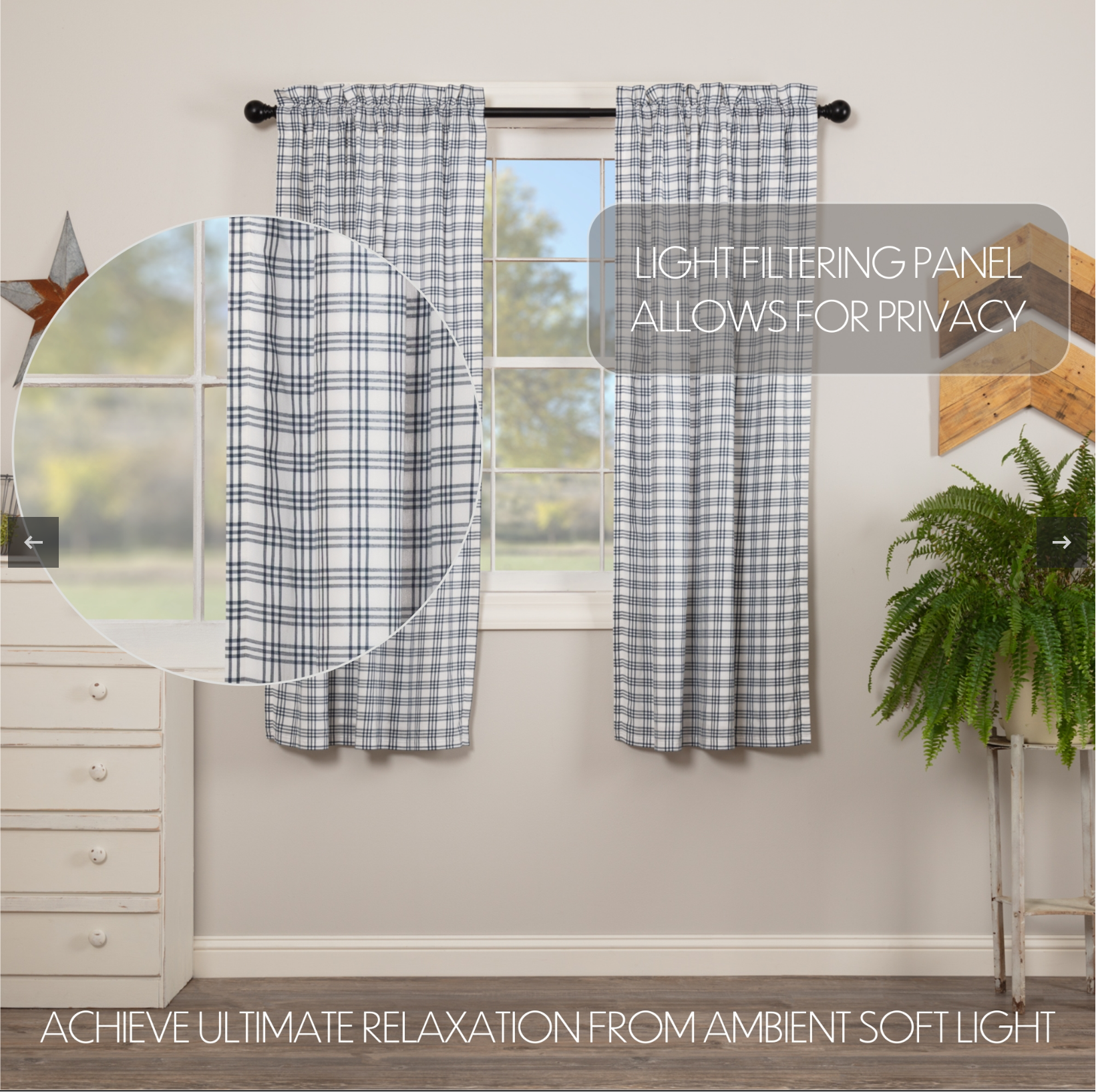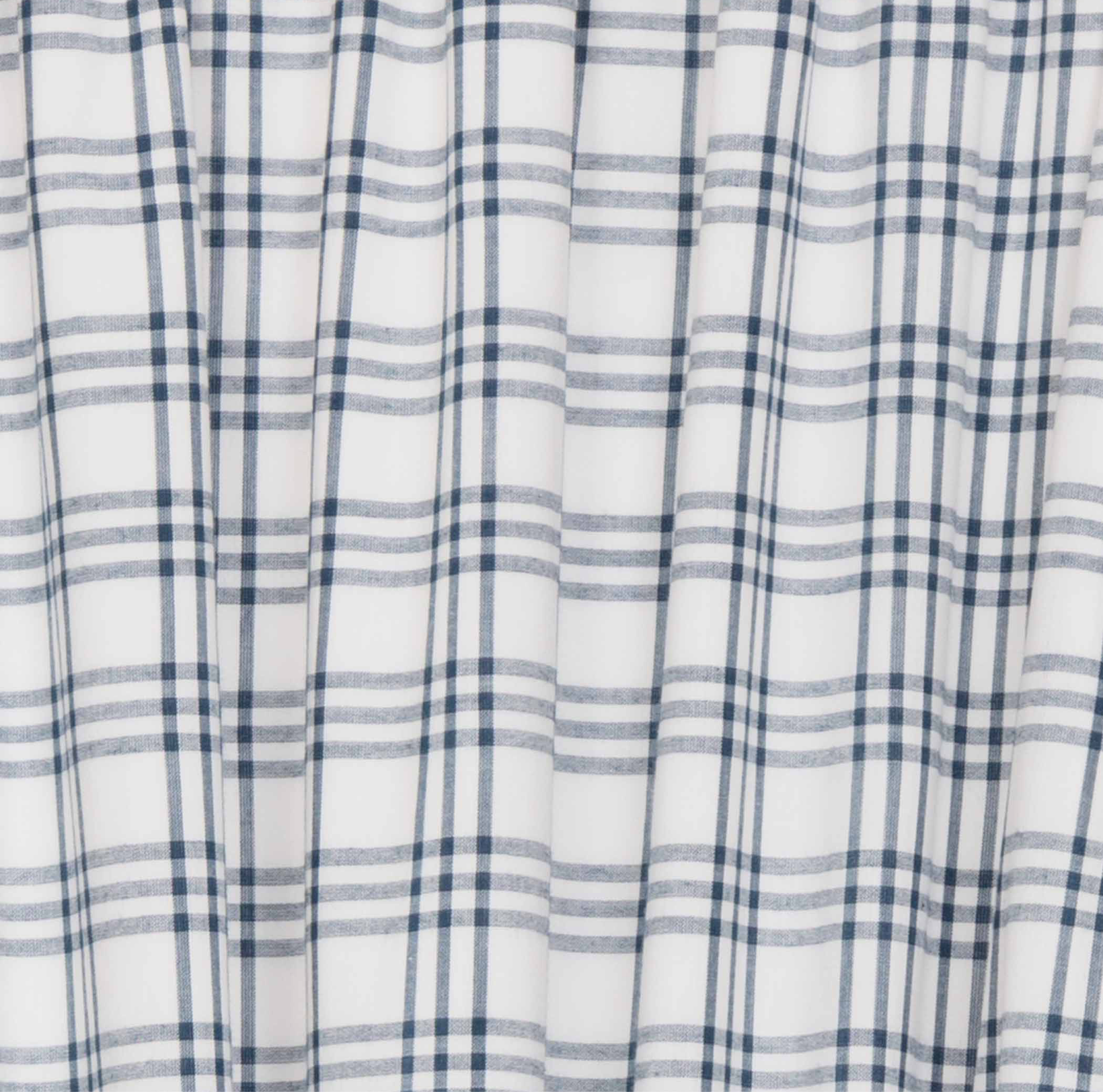 Create a clean, modern farmhouse look for your home. The Sawyer Mill Blue Plaid Short Panel Set of 2 63x36 features beautiful denim blue striping over a white base to create a classic yet modern-feeling plaid. Includes matching tie backs and a soft, white cotton lining to filter sunlight and prevent fading. A rod pocket and loops offer easy hanging options.